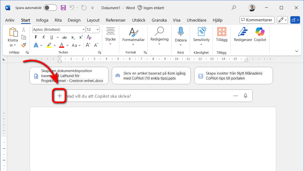 Öppna ett tomt Word-dokument, och klicka på den lilla plus-knappen till vänster om "Vad vill du att Copilot ska skriva?"-fältet: