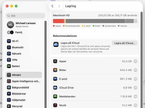 Om användaren oväntat får väligt lite eller slut på lagringsutrymme på sin Mac, kolla i lagringsinställningarna om Systemdata plötsligt tar upp flera hundra GB: